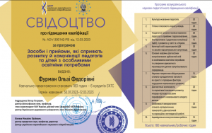 Фурман О.Ф. Програма підвищення кваліфікації «Засоби і прийоми, які сприяють розвитку й комунікації педагогів та дітей з особливими освітніми потребами»; 30.01.2023 – 12.03.2023; 180 академічних годин / 6 кредитів ECTS; Центр українсько-європейського наукового співробітництва (Україна). |