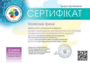 Колесник І. Міжнародна конференція «Освіта сьогодення: життєтворчість як основа національного відродження та єдності»; 17.10.2024; 6 академічних годин / 0,2 кредиту ECTS; Хортицька національна академія (Україна). |