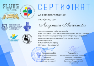 Анісімова Л. Цикл майстер-класів «Театрально-терапевтична методика Келлі Хантер»; 11–15.10.2022; 18 академічних годин / 0,6 кредиту ECTS; Flute Theatre, Хортицька національна академія, Львівський національний університет імені Івана Франка, Запорізький національний університет (Україна). |