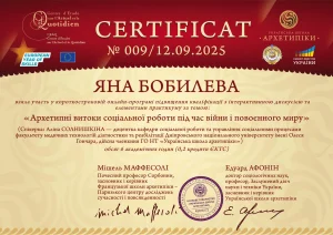 Бобилева Я. Короткострокова онлайн-програма підвищення кваліфікації «Архетипні витоки соціальної роботи під час війни і повоєнного миру»; 12.09.2025; 6 академічних годин / 0,2 кредиту ECTS; Centre d’Étude sur l’Actuel et le Quotidien, Українська школа архетипіки (Україна). |
