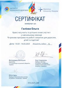 Галієва О.М. Навчальний семінар «8 крокова програма по роботі з втратою для дорослих, дітей та підлітків»; 10.03.2025 – 14.03.2025; 15 академічних годин; Інститут психології здоров’я, Akershus University Hospital (Україна, Норвегія). |