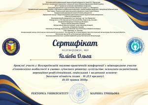 Галієва О.М. Всеукраїнська науково-практична конференція «Становлення особистості в умовах сучасного розвитку суспільства: психолого-педагогічний, корекційно-реабілітаційний, соціальний і медичний аспекти»; 01–02.05.2025; 16 академічних годин / 0,5 кредиту ECTS; Полтавський національний педагогічний університет імені В. Г. Короленка (Україна). |