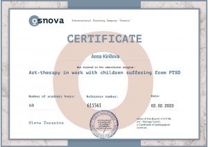 Kirillova A. Art-therapy in work with children suffering from PTSD (educational program); 02.02.2023; 60 academic hours; International Training Company «Osnova» (Ukraine). |