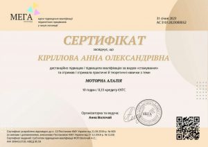 Кіріллова А.О. Стажування «Моторна алалія»; 31.01.2023; 10 академічних годин / 0,33 кредиту ECTS; ФОП Волочай А.С. (Україна). |