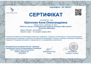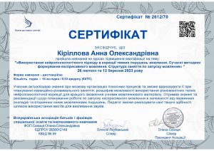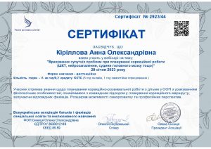 Кіріллова А.О. Підвищення кваліфікації «Використання нейропсихологічного підходу в корекції тяжких порушень мовлення. Сучасні методики формування експресивного мовлення. Структура заняття по запуску мовлення»; 26.02.2023, 12.03.2023; 16 академічних годин / 0,53 кредиту ECTS; Всеукраїнська асоціація батьків і фахівців спеціальної освіти та інклюзивного навчання, ФОП Синиця О. О. (Україна). |