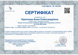 Кіріллова А.О. Вебінар «Норми онтогенезу для побудови ефективної корекційної роботи»; 14.01.2023; 6 академічних годин / 0,2 кредиту ECTS; Всеукраїнська асоціація батьків і фахівців спеціальної освіти та інклюзивного навчання, ФОП Синиця О.О. (Україна). |