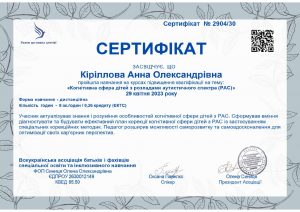 Кіріллова А.О. Підвищення кваліфікації «Когнітивна сфера дітей з розладами аутистичного спектра (РАС)»; 29.04.2023; 0,26 кредиту ECTS; Всеукраїнська асоціація батьків і фахівців спеціальної освіти та інклюзивного навчання, ФОП Синиця О.О. (Україна). |