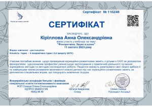 Кіріллова А.О. Вебінар «Фоноритміка. Звуки в рухах»; 11.02.2023; 6 академічних годин / 0,2 кредиту ECTS; Всеукраїнська асоціація батьків і фахівців спеціальної освіти та інклюзивного навчання, ФОП Синиця О.О. (Україна). |