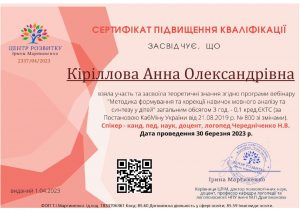 Кіріллова А.О. Вебінар «Методика формування та корекції навичок мовного аналізу та синтезу у дітей»; 30.03.2023; 3 академічні години / 0,1 кредиту ECTS; Центр розвитку Ірини Мартиненко, ФОП Мартиненко Т. І. (Україна). |