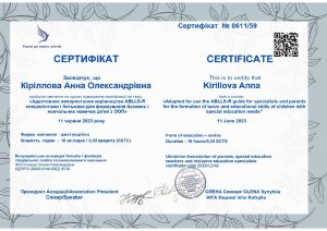 Кіріллова А.О. Підвищення кваліфікації «Адаптоване використання керівництва ABLLS-R спеціалістами і батьками для формування базових і навчальних навичок дітей з ООП»; 11.06.2023; 10 академічних годин / 0,33 кредиту ECTS; Всеукраїнська асоціація батьків і фахівців спеціальної освіти та інклюзивного навчання, ФОП Синиця О.О. (Україна). |