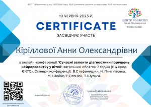 Кіріллова А.О. Онлайн-конференція «Сучасні аспекти діагностики порушень нейророзвитку у дітей»; 10.06.2023; 7 академічних годин / 0,4 кредиту ECTS; Центр розвитку Ірини Мартиненко, ФОП Мартиненко Т. І. (Україна). |