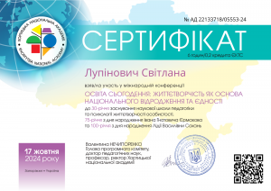 Лупінович С. Міжнародна конференція «Освіта сьогодення: життєтворчість як основа національного відродження та єдності»; 17.10.2024; 6 академічних годин / 0,2 кредиту ECTS; Хортицька національна академія (Україна). |