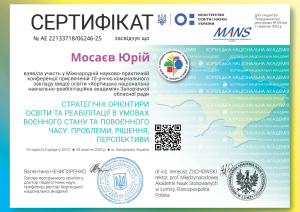 Мосаєв Ю. Міжнародна науково-практична конференція «Стратегічні орієнтири освіти та реабілітації в умовах воєнного стану та повоєнного часу: проблеми, рішення, перспективи»; 29.10.2025; 10 академічних годин / 0,3 кредиту ECTS; Хортицька національна академія, Мала академія наук України (Україна). |