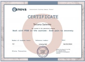 Saienko T. Work with PTSD in the wartime: from pain to recovery (educational program); 06.03.2024; 42 academic hours; International Training Company “Osnova” (Ukraine). |