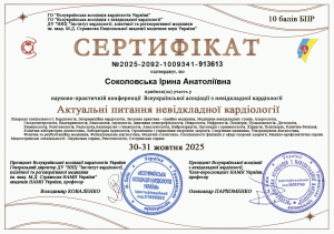 Соколовська І.А. Науково-практична конференція «Актуальні питання невідкладної кардіології»; 30–31.10.2025; ГО «Всеукраїнська асоціація кардіологів України», ГО «Всеукраїнська асоціація з невідкладної кардіології» (Україна). |