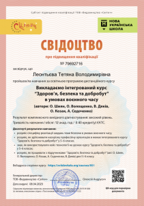 Леонтьєва Т.В. Дистанційний курс «Викладаємо інтегрований курс «Здоров’я, безпека та добробут» в умовах воєнного часу»; 08.04.2023; 12 академічних годин / 0,4 кредиту ECTS; ТОВ «Видавництво “Світич”» (Україна). |
