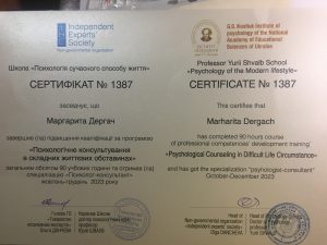Derhach M. Psychological Counseling in Difficult Life Circumstances (advanced training program); October–December 2023; 90 academic hours / (credits not specified); Independent Experts Society, C.S. Kostiuk Institute of Psychology of the National Academy of Educational Sciences of Ukraine (Ukraine). |
