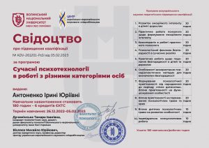 Антоненко І.Ю. Програма підвищення кваліфікації «Сучасні психотехнології в роботі з різними категоріями осіб»; 26.12.2022 – 05.02.2023; 180 академічних годин / 6 кредитів ECTS; Волинський національний університет імені Лесі Українки, Центр українсько-європейського наукового співробітництва (Україна). |