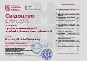 Бочелюк В.Й. Програма підвищення кваліфікації «Сучасні психотехнології в роботі з різними категоріями осіб»; 26.12.2022 – 05.02.2023; 180 академічних годин / 6 кредитів ECTS; Волинський національний університет імені Лесі Українки, Центр українсько-європейського наукового співробітництва (Україна). |