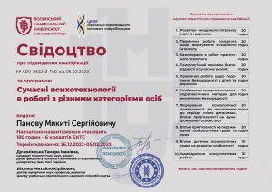 Панов М.С. Програма підвищення кваліфікації «Сучасні психотехнології в роботі з різними категоріями осіб»; 26.12.2022 – 05.02.2023; 180 академічних годин / 6 кредитів ECTS; Волинський національний університет імені Лесі Українки, Центр українсько-європейського наукового співробітництва (Україна). |