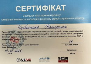 Червоненко К. Тренінг «Актуальні виклики та інноваційні рішення у сфері соціального захисту»; 19.05.2025; 16 академічних годин; Благодійна організація «100% життя. Запоріжжя», USAID, UNICEF (Україна). |