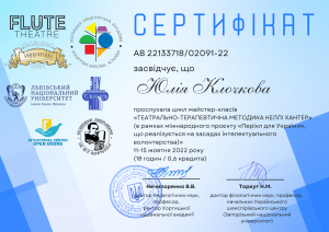 Клочкова Ю. Цикл майстер-класів «Театрально-терапевтична методика Келлі Хантер»; 11–15.10.2022; 18 академічних годин / 0,6 кредиту ECTS; Flute Theatre, Хортицька національна академія, Львівський національний університет імені Івана Франка, Запорізький національний університет (Україна). |