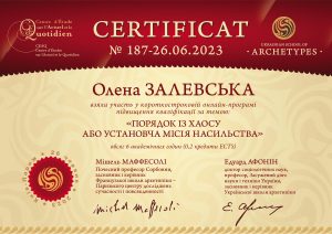 Залевська О. Короткострокова онлайн-програма підвищення кваліфікації «Порядок із хаосу або установча місія насильства»; 26.06.2023; 6 академічних годин / 0,2 кредиту ECTS; Centre d’Étude sur l’Actuel et le Quotidien, Українська школа архетипіки (Україна). |
